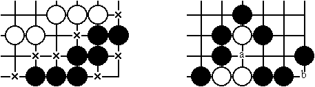Wird durch das Setzen eines Steines die letzte Freiheit von einer oder mehreren Ketten der gegnerischen Farbe besetzt, so werden alle Steine der betreffenden Ketten geschlagen. Setzt Schwarz zum Beispiel im rechten Diagramm auf den Schnittpunkt a, werden die drei eingeschlossenen weißen Steine geschlagen. Gemäß der sogenannten Selbstmordregel darf ein Stein nie so gesetzt werden, daß er einer eigenen Kette die letzte Freiheit nimmt, es sei denn, mindestens ein gegnerischer Stein wird durch den Zug geschlagen. So darf Weiß nicht in die Ecke b setzen. Ab und zu werden die Zugmöglichkeiten noch in einer anderen Weise durch die sogenannte Ko-Regel eingeschränkt: Danach darf ein Zug nicht die Situation wiederherstellen, von der aus der Gegner zuletzt gezogen hat - Zugwiederholungen durch das Schlagen und Zurückschlagen von jeweils einem Stein werden damit unterbunden.